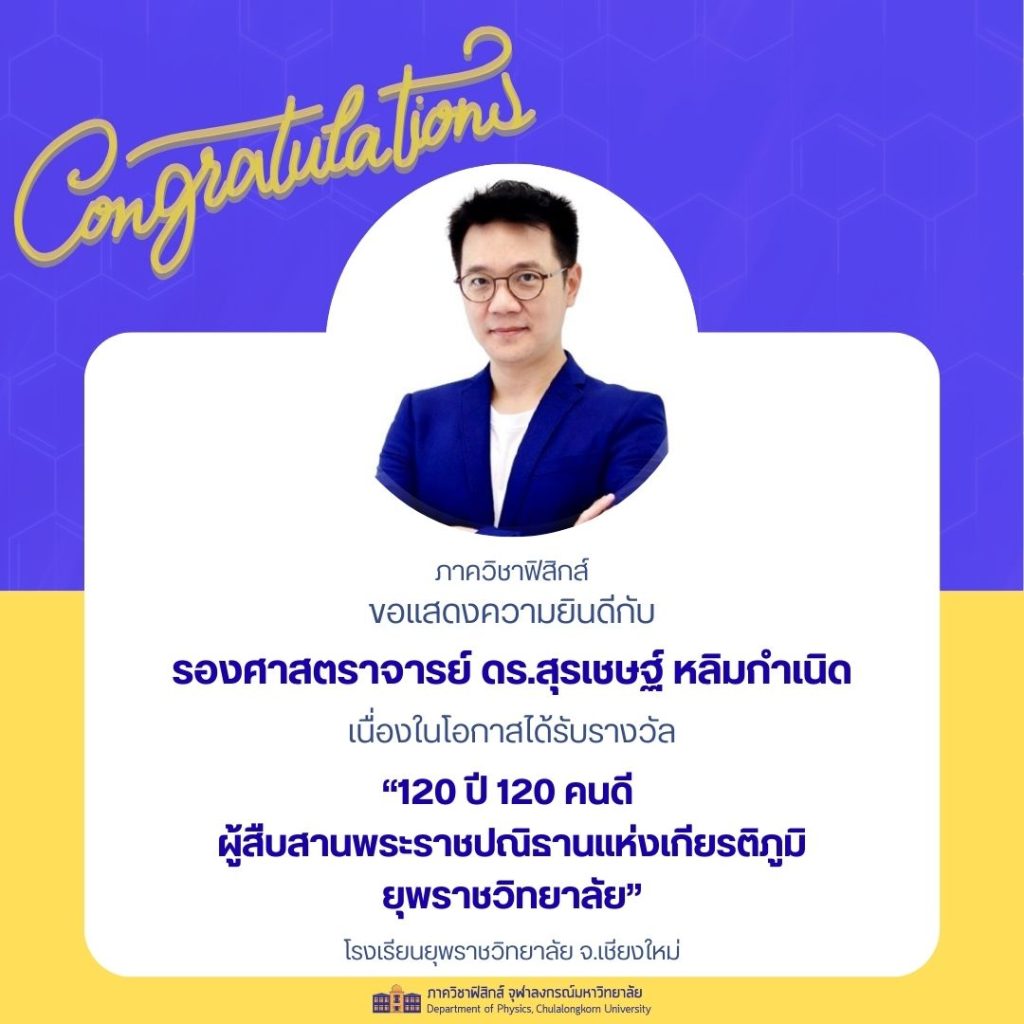 Department Activities, News & Eventsขอแสดงความยินดีกับรองศาสตราจารย์ ดร.สุรเชษฐ์ หลิมกำเนิด Posted on ธันวาคม 29, 2568 by phys 🎉👏💐ภาควิชาฟิสิกส์ ขอแสดงความยินดีกับ รองศาสตราจารย์ ดร.สุรเชษฐ์ หลิมกำเนิด เนื่องในโอกาสที่ได้รับรางวัล 120 ปี 120 คนดี ผู้สืบสานพระราชปณิธานแห่งเกียรติภูมิยุพราชวิทยาลัย เมื่อวันพุธที่ 24 ธันวาคม 2568 ณ โรงเรียนยุพราชวิทยาลัย จ.เชียงใหม่