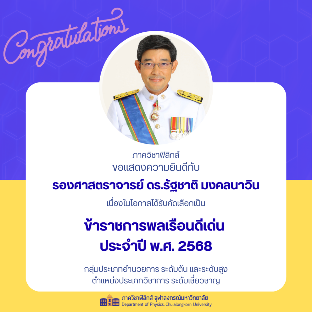 Department Activities, News & Eventsขอแสดงความยินดีกับ รศ.ดร.รัฐชาติ มงคลนาวิน ข้าราชการพลเรือนดีเด่น ประจำปี พ.ศ. 2568 Posted on มีนาคม 19, 2569มีนาคม 19, 2026 by phys 💐 🎉 ภาควิชาฟิสิกส์ ขอแสดงความยินดีกับรองศาสตราจารย์ ดร.รัฐชาติ มงคลนาวิน เนื่องในโอกาสได้รับคัดเลือกเป็น ข้าราชการพลเรือนดีเด่น ประจำปี พ.ศ. 2568 กลุ่มประเภทอำนวยการ ระดับต้น และระดับสูง ตำแหน่งประเภทวิชาการ ระดับเชี่ยวชาญ